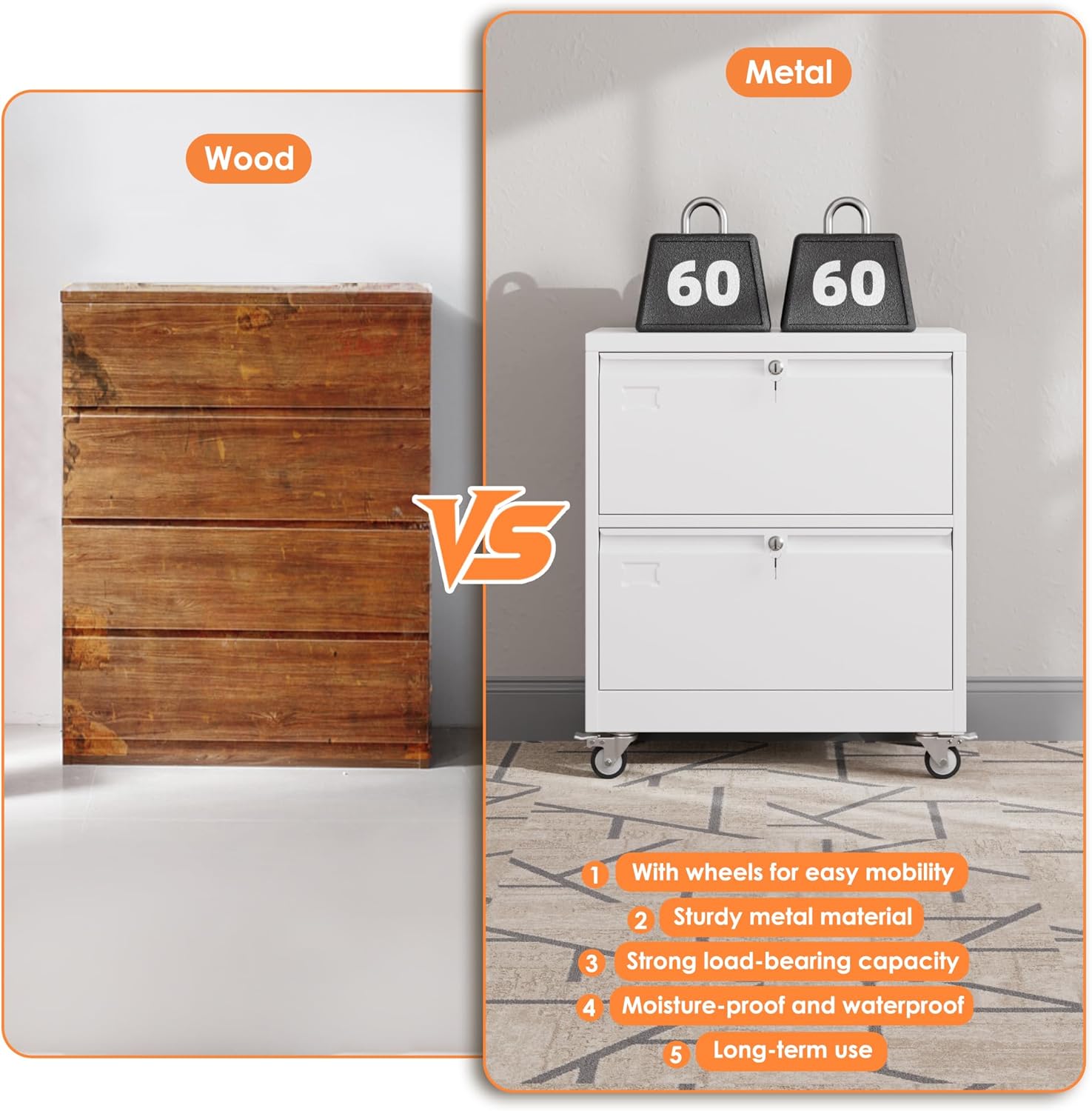 Aobabo Metal 2 Drawer Lateral File Mobile Cabinet with 2 Lock, File Cabinet with Wheels and Adjustable File Bars for Office,Home, for Letter/Legal Size,White, Assembly Required