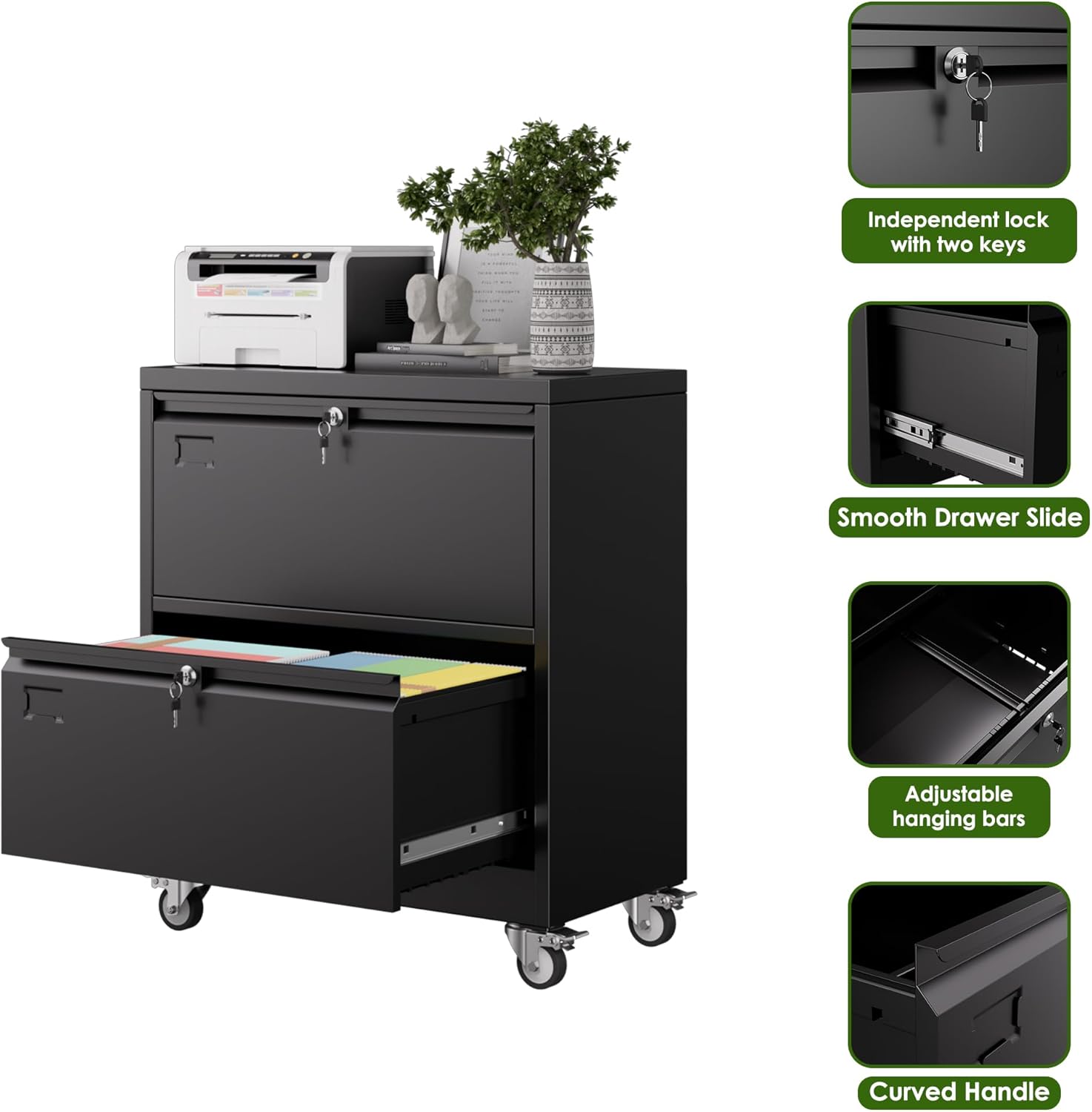- [Larger and Deeper] 2 drawer file cabinet with wheels has deep&spacious drawers . Each drawer of the file cabinet has 1 adjustable bars for hanging Letter/Legal size files,hanging file folders to keep your document organized.