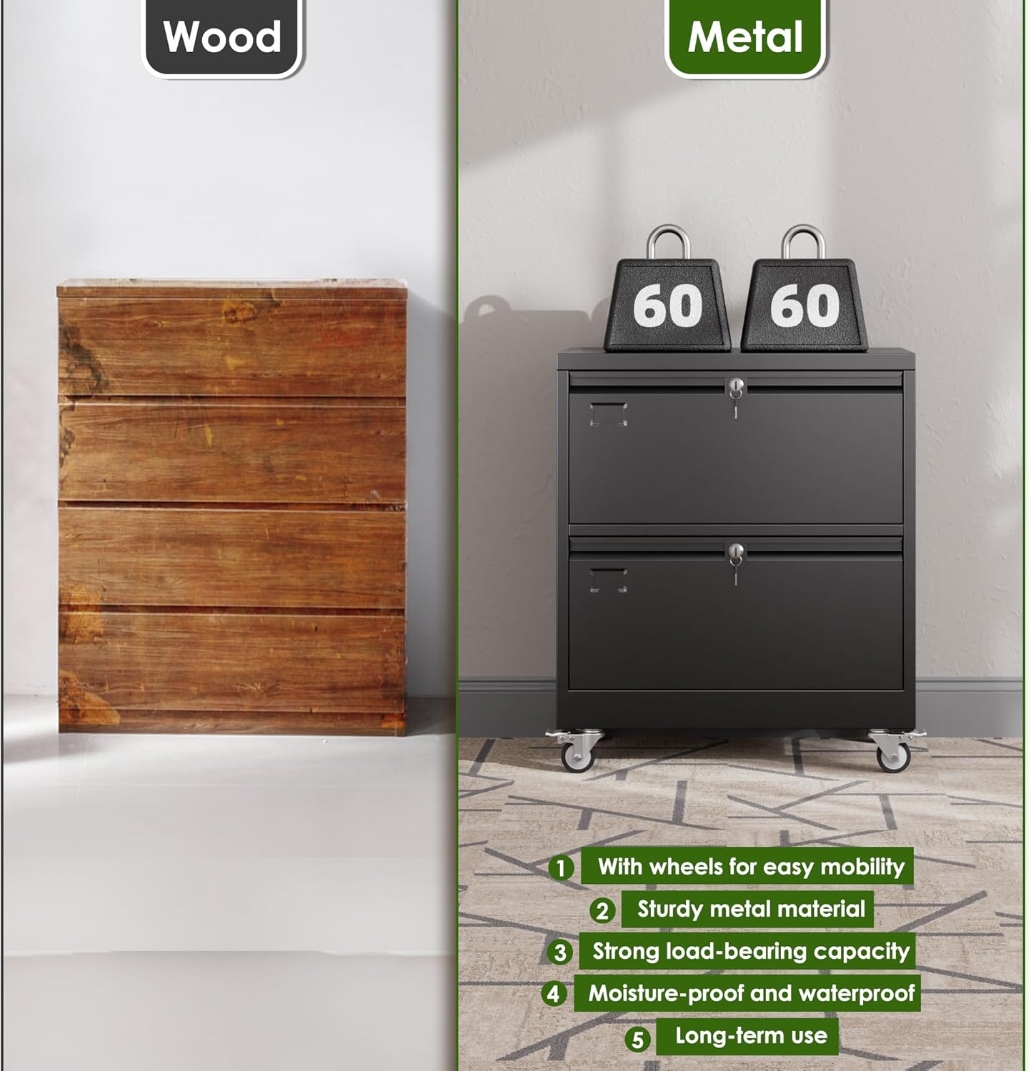- [All-steel Stable-Rustproof] 2 drawer file cabinet with wheels has a reinforced steel frame with a corrosion and stain-resistant powder coat, Rugged and not easily deformed,which is ideal for long-term use.