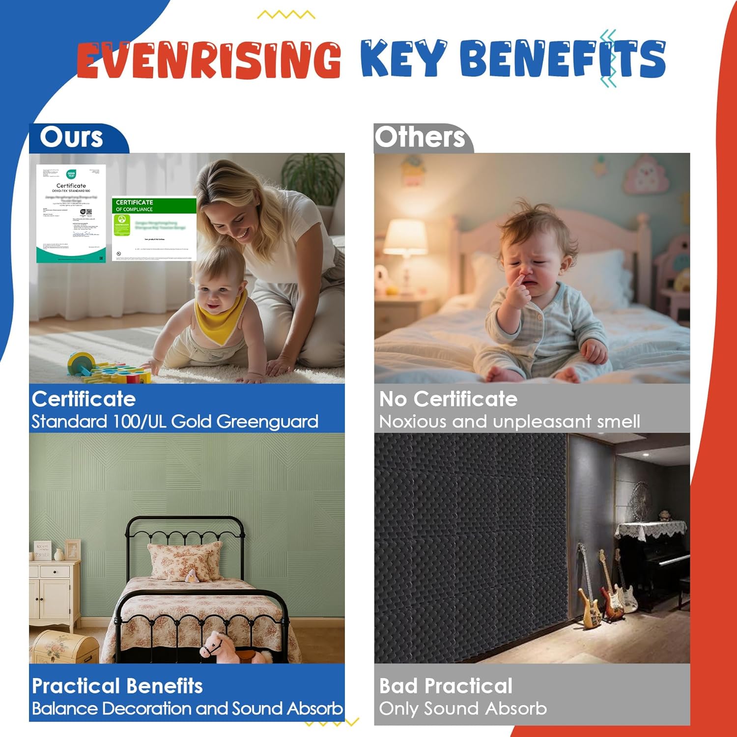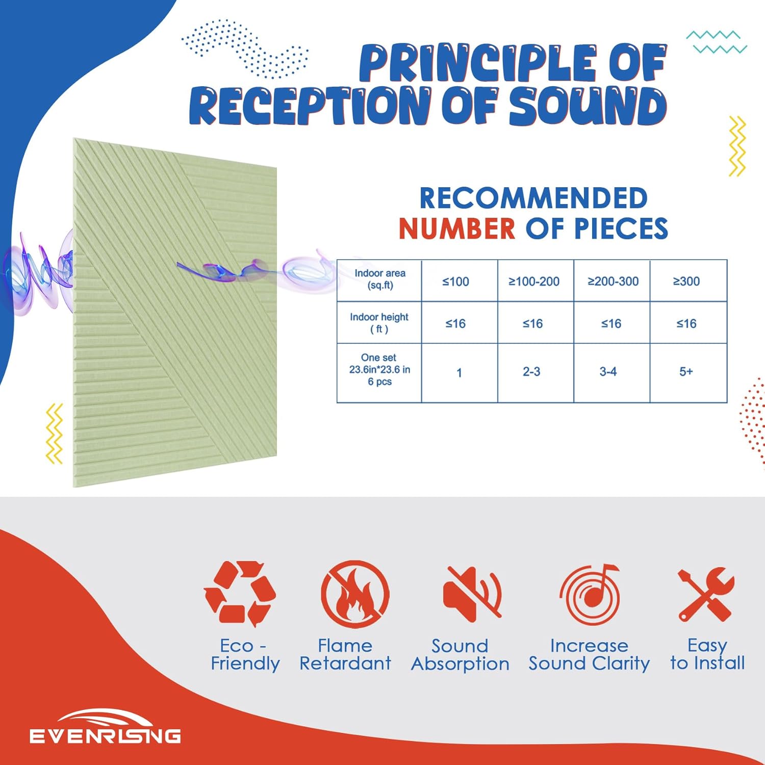 - ♻️【Upgraded Acoustic Features 】EVENRISING sound panels help reduce unwanted reflected sound in any room of your home or building, they are lightweight and are easy to mount on the wall, doors and ceiling. Help reduce background noise, echoes, reverberation time(RT), and decrease standing waves (that's what makes noisy studios or offices so bad).