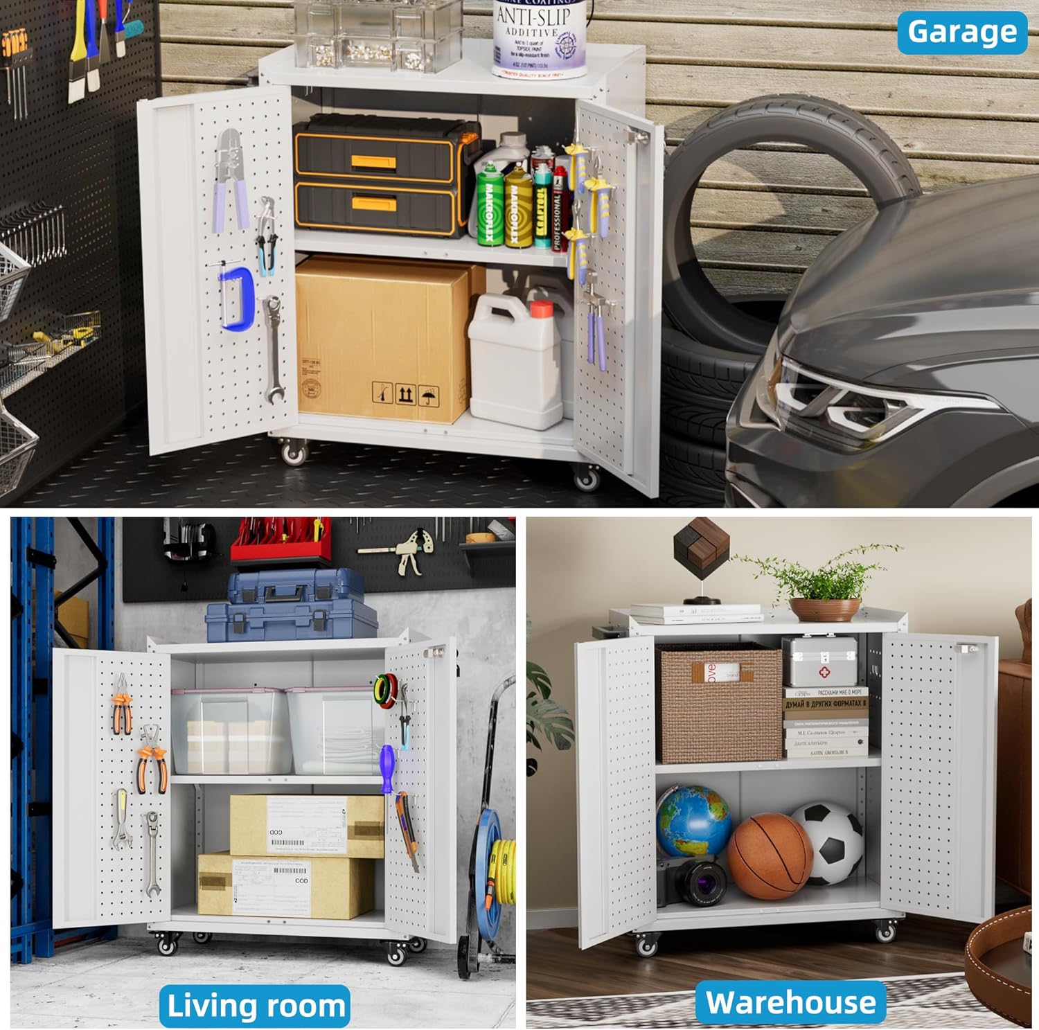 Aobabo 34.3" H Garage Storage Cabinet with Wheels,Lockable Metal Storage Cabinet with 2 Doors for Garage Home Office Storage,White,Assembly Required