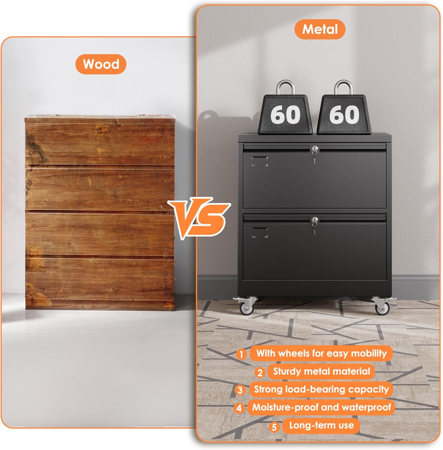 - ăLateral File Cabinet on WheelsăThe new design file cabinet with wheels is made of heavy duty steel material, and the surface with powder coating is very smooth, which can avoid rust. Due to their metal surface, metal storage cabinets are easy to clean and maintain.The wheels can be locked, placed fixedly or moved freely