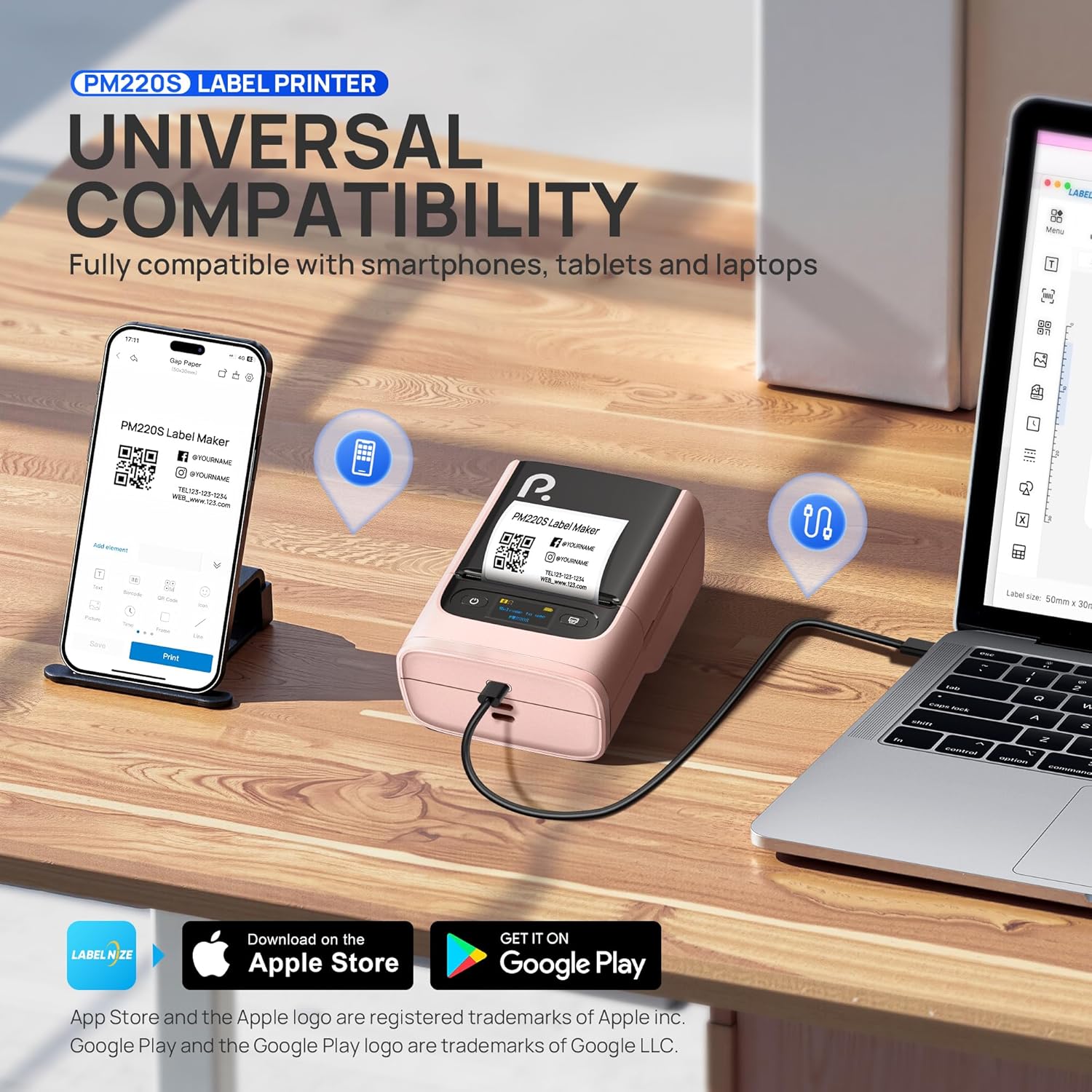 - 【Feature-Rich App】PM220S label maker machine with tape comes with label templates and can set up your own templates.The label printer app supports QR codes, barcodes, tables, text, icons, and more. Enjoy 90+ fonts, 14+ languages, and 450+ material presets. Pro tip: Use our specialized labels for optimal results—avoid tearing the green back sticker to prevent printing issues.