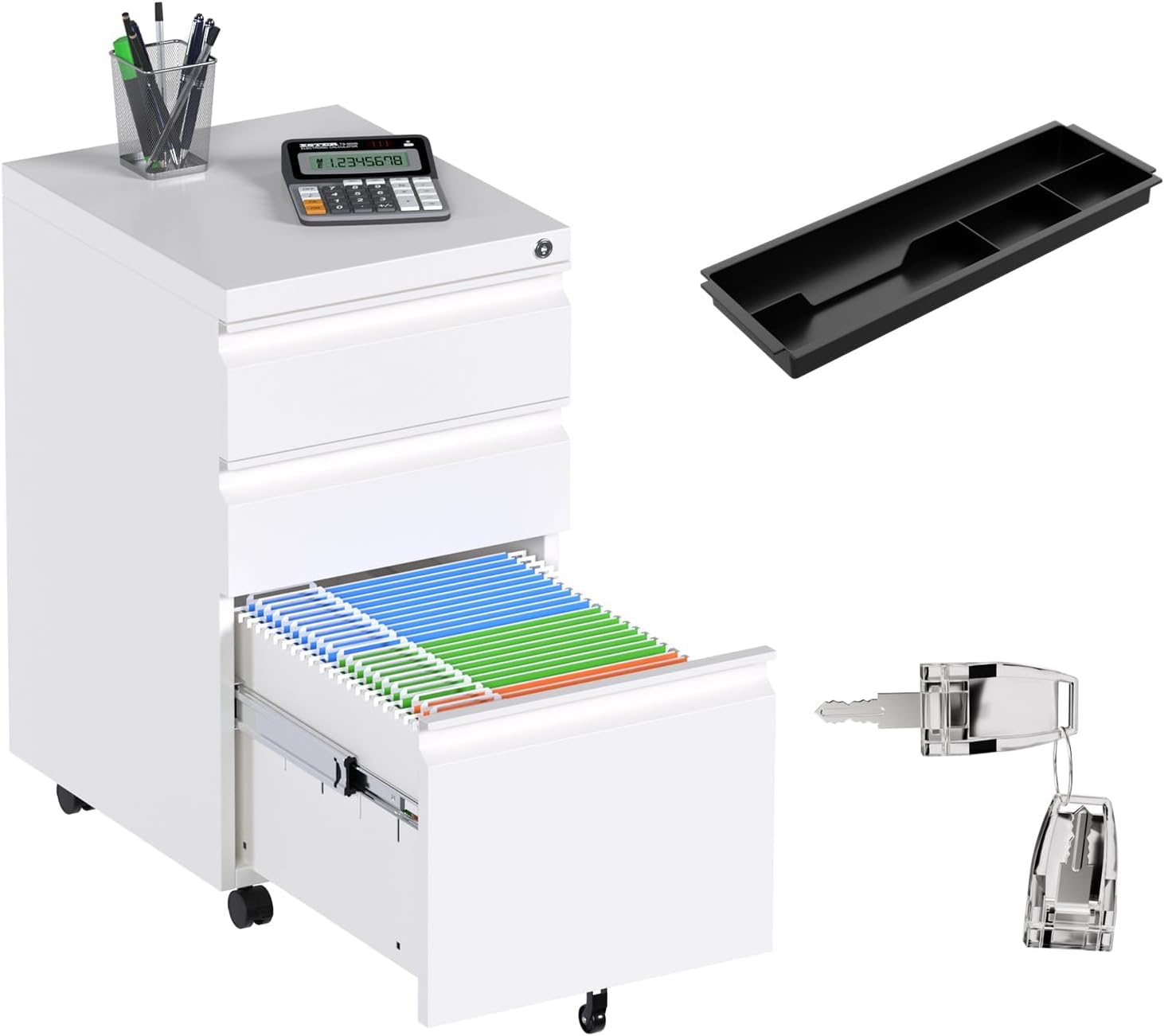Aobabo Metal 3 Drawer Mobile File Cabinet with Lock, Under Desk Metal Filing Cabinet wiht Wheels, 23.6''H A4/Legal/Letter Size Storage Cabinet, Fully Assembled Except Wheels,White