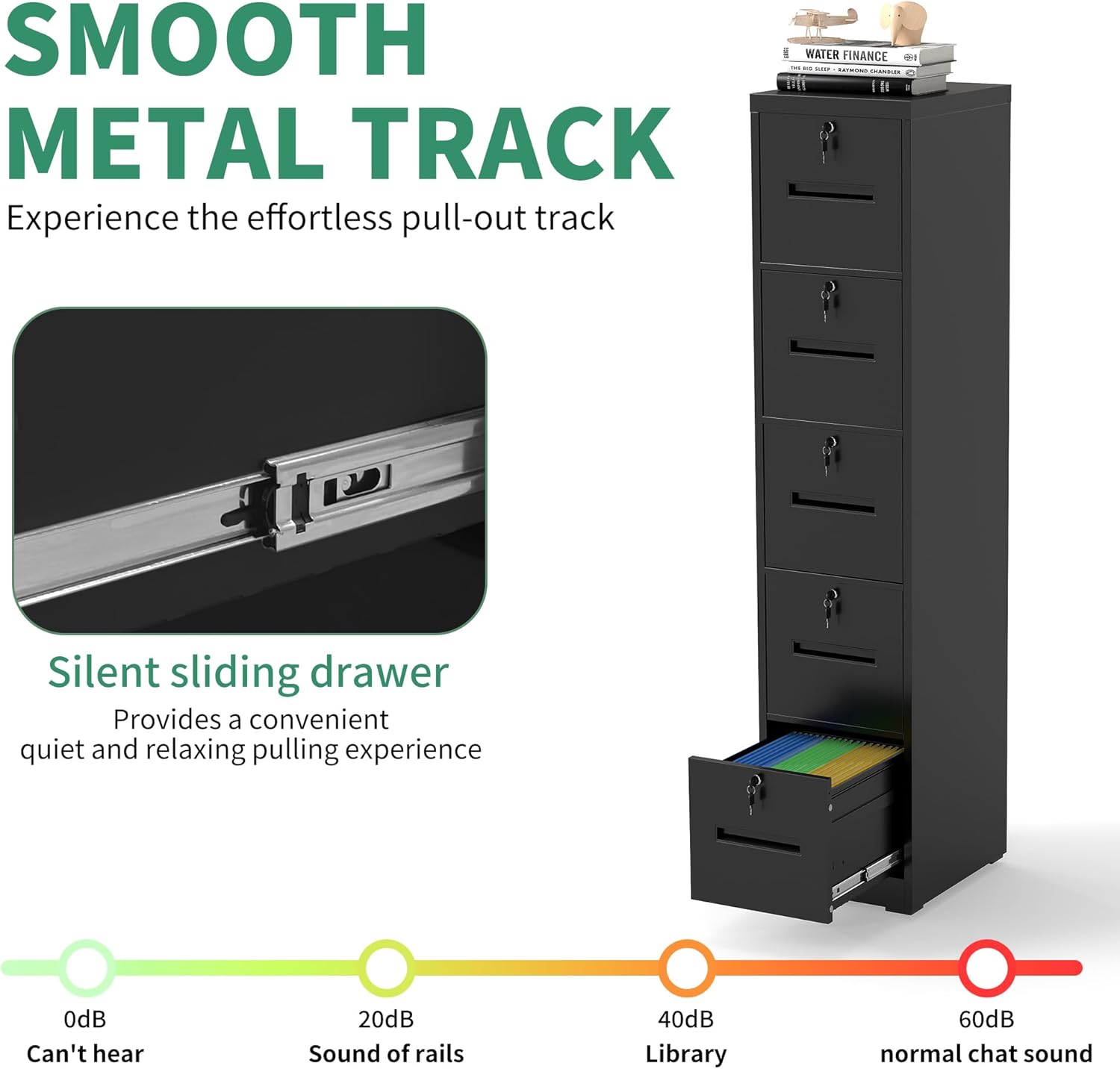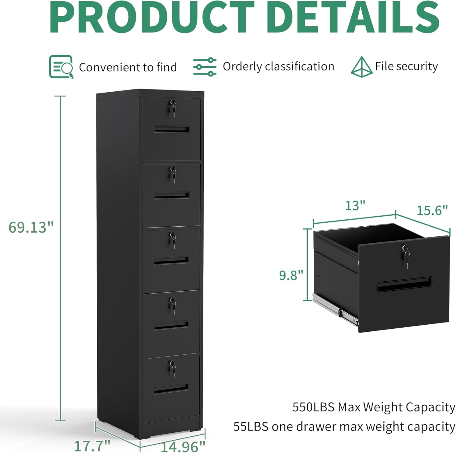 File Cabinet 5 Drawer with Lock, Vertical Filing Cabinets for Home Office, Metal Steel Storage Cabinet for Letter/Legal Size File, Assembly Required(Black)
