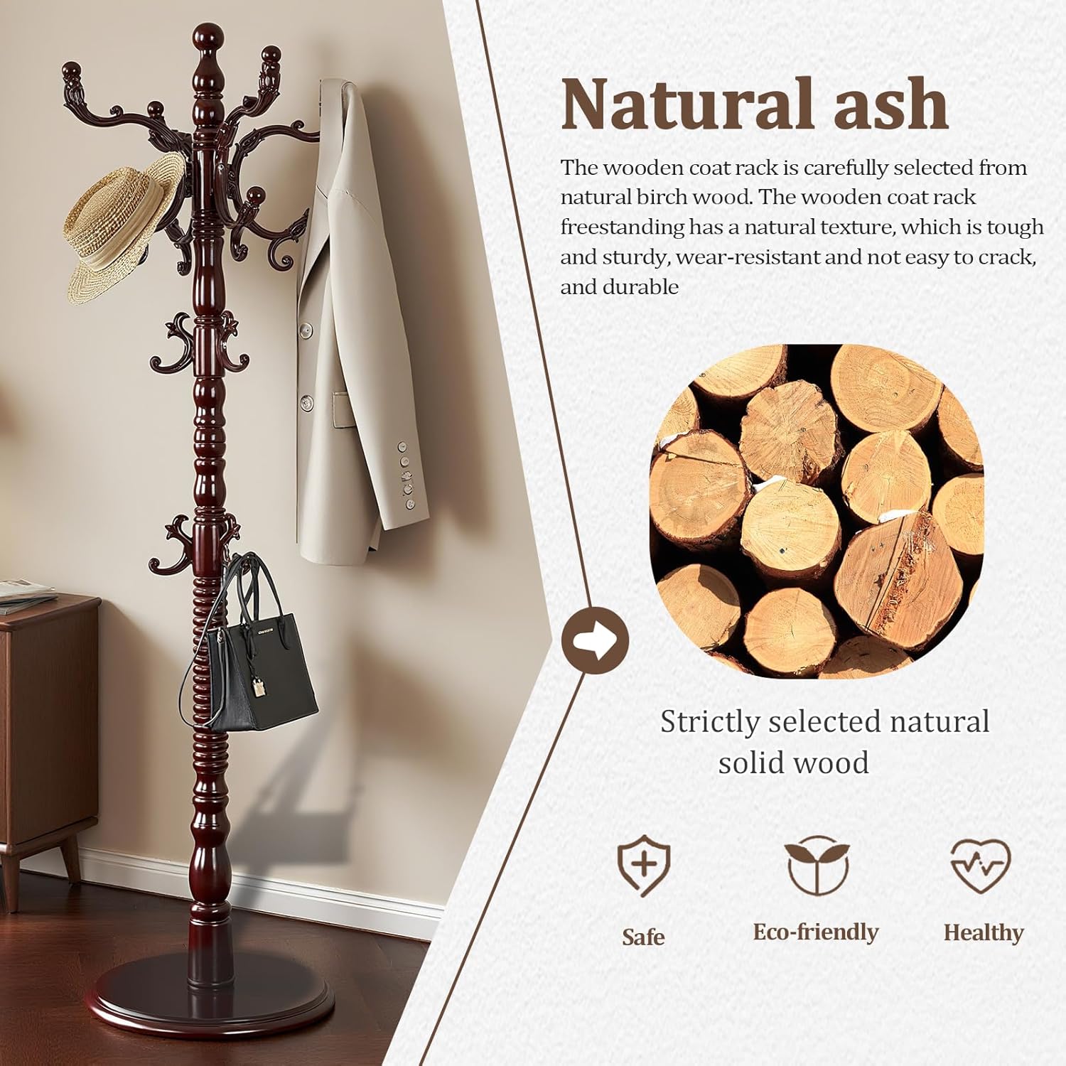 - STURDY SOLID BASE DESIGN: This coat rack freestanding stands out with a rock-solid solid wood base, staying stable even under 120 lbs. Its resin hooks have smooth rounded balls to avoid fabric snags on coats or scarves. This care makes the wooden coat rack durable yet gentle on belongings. Whether hanging heavy winter coats or lightweight totes, this coat rack stays firm—no wobbling. As a reliable wooden coat rack, it handles daily use without losing vintage charm, and this coat rack freestanding design needs no wall mounting, fitting any spot.