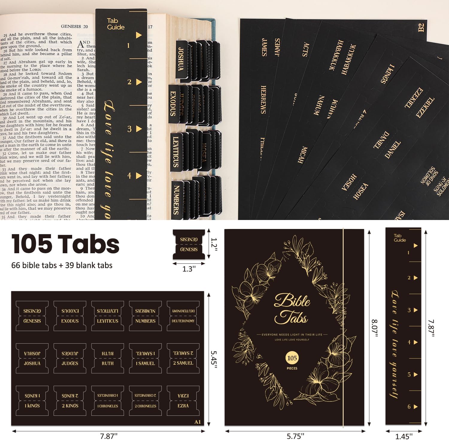 Laminated Bible Tabs, Gold Foil Embossed Lettering Bible Chapter Index Tabs for Women Men, Reposition Large Print Sticky Labels, Easy to Read and Apply, 105Chapters Labels for Easy Navigation (Black)