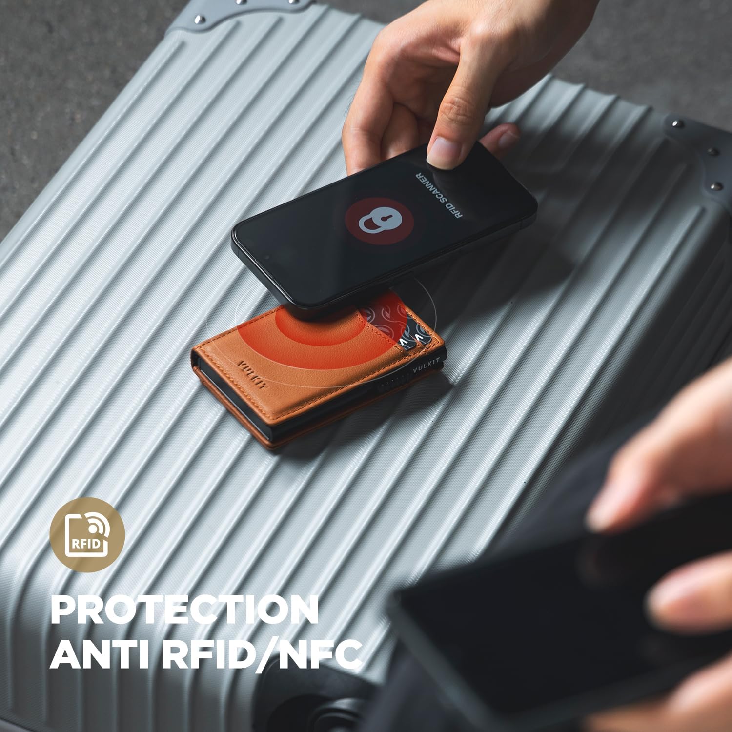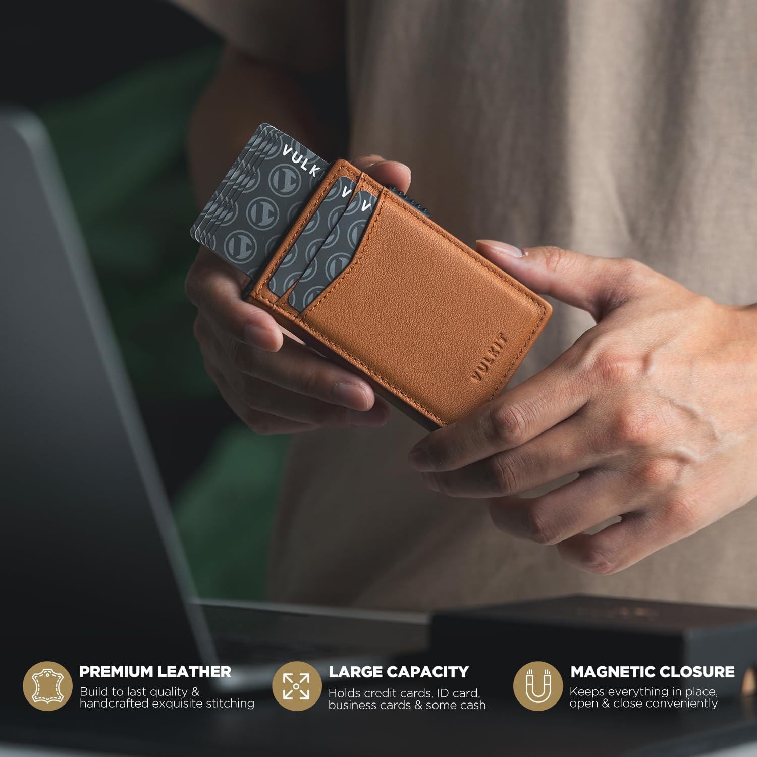 VULKIT Men's Wallet with ID Window Top Grain Leather RFID Blocking Minimalist Wallet Pop Up Card Holder Magnetic Closure